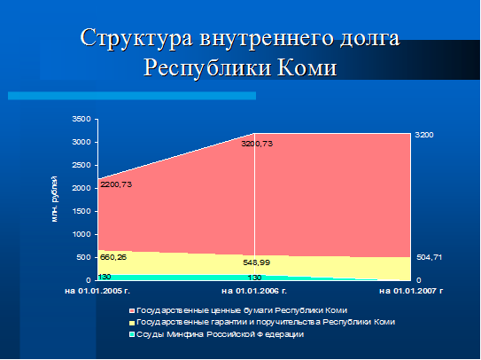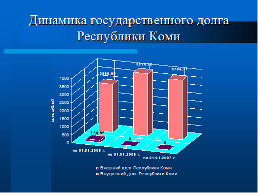 За 2006 годгосударственный долг Республики Коми сократился на 175,1 млн. рублей, или на 4,5% и составил на начало текущего года 3704,7 млн. рублей (рис. 16).