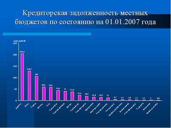 Реализация в 2005–2006 годах мероприятий программы реформирования региональных финансов позволила снизить величину кредиторской задолженности бюджетных организаций, финансируемых из республиканского бюджета более чем в два раза. Так, если по состоянию на 1 января 2005 года она составляла 513 млн. рублей(в том числе просроченная задолженность – 124 млн. рублей), то на 1 января 2007 года она снизилась до 211 млн. рублей (в том числе просроченная – 57 млн. рублей). Аналогичная тенденция наблюдается и по кредиторской задолженности бюджетных организаций, финансируемых из местных бюджетов, которая уменьшилась с 1 млрд. 322 млн. рублей по состоянию на 1 января 2005 года, в т.ч. 866 млн. рублей – просроченная задолженность, до 781 млн. рублей – на 1 января 2007 года, в том числе просроченная – 506 млн. рублей (рис. 18).Среди муниципальных образований наибольшую кредиторскую задолженность имеют Воркута (204 млн. рублей), Инта (129 млн. рублей), Усинск (106 млн. рублей). Хотелось бы обратить внимание Глав муниципальных образований и бюджетополучателей средств республиканского бюджета на необходимость принятия мер по урегулированию сумм кредиторской задолженности и предотвращению возникновения просроченных обязательств.