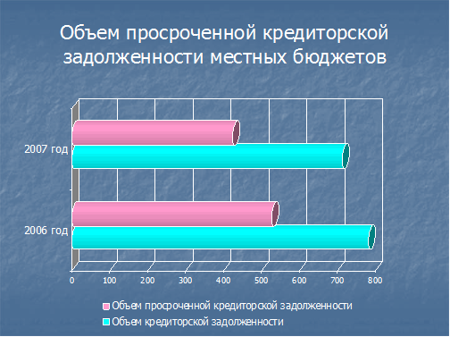 Нормализацию исполнения местных бюджетов республики в последние годы подтверждает устойчивое снижение объема просроченной кредиторской задолженности указанных бюджетов: если на начало 2006 года её объём составлял 872,3 млн. рублей, то за два последних года она снижена более, чем в два раза и на начало 2008 года составила 423,5 млн. рублей (рис. 19).