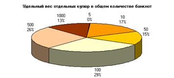 Банковские билеты (банкноты) – вид денежных знаков, законное платежное средство, выпускаемое в обращение центральными банками. После проведения деноминации (укрупнения масштаба цен) с 1 января 1998 г. в обращении находятся банкноты достоинством 10, 50, 100, 500 и 1000 рублей, а также монеты достоинством 1, 2, 5 рублей и 1,5,10 и 50 копеек. ( диагр.1) Диаграммы 1(данные на 01.01.2003)