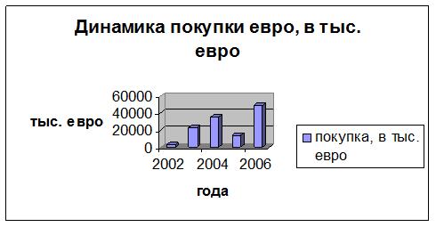 Из рисунка 3 мы можем сделать вывод, что пик покупки евро приходится на 2006 г и составляет 48 606,8 тыс. евро, а наименьший объем покупки евро приходится на 2002 г. и составляет 2 307,8 тыс. евро., что на 462999 тыс. евро меньше чем в 2006 г. Хотя в целом мы можем видеть положительную динамику роста покупки евро, но несмотря на это в 2005 г. мы можем наблюдать сильный спад покупки евро который составлял 13 056,4 тыс. евро, что на 22268,9 тыс. евро и меньше чем в 2004 г и на 33550,4 тыс. евро меньше чем в 2006 г.
