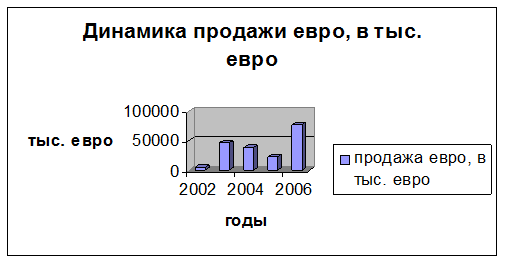 Из рисунка 4 мы можем сделать вывод, что пик покупки евро приходится на 2006 г и составляет 77 042,9тыс. евро, а наименьший объем покупки евро приходится на 2002 г. и составляет 5 011,8 тыс. евро., что на 72031,1тыс. евро меньше чем в 2006 г. Хотя в целом мы можем видеть положительную динамику роста покупки евро, но несмотря на это в 2004 г. и 2005 г. мы можем видеть спад продажи евро и в 2004 г. продажа евро составляла 39 451,9 тыс. евро, а в 2005 г. - 22 946,9 тыс. евро, что на 16505 тыс. евро меньше чем в 2004 г и на 54 096 тыс. евро.