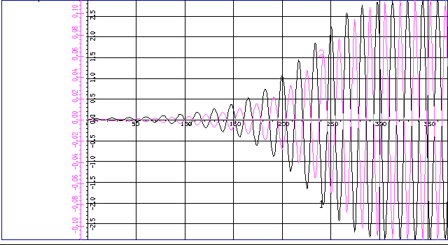 Второе решение выполним так, чтобы запись началась в режиме установившихся колебаний и длилась около двух периодов. Тогда по таблице решения можно с достаточной точностью установить амплитуду и период колебаний. Данные для второго решения приведены в таблице 7.