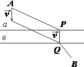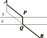 вектор v = PQ определяется лишь прямыми a и b. Поэтому надо найти такое положение точки P, при котором сумма AP +QB будет наименьшей. Пока отрезки AP и QB удалены друг от друга. →