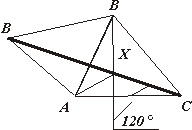 Чтобы искать наименьшее значение суммы, надо построить ломаную из отрезков XA, XB, XC. Для этого повернём треугольник ABX вокруг точки А в сторону от треугольника ABC на 60о.Получим: ∆AB’X ’ =∆ABX’ (рис.18).