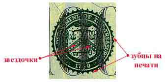 Отпечатаны зеленым цветом, круглые. На подлинных долларах, изображения на печатях отчетливо видно, зубцы ровные и острые. Звездочки внутри нее под увеличительным стеклом выглядят четко. На поддельных они могут быть размыты, с неровностями или иметь разрывы. С выпуском новых купюр номиналом в 100 долларов вокруг портрета появилась повторяемая надпись "The United States of America". В старых купюрах всегда указывался федеральный резервный округ, в котором была выпущена (эмитирована) банкнота, теперь это единая печать Федеральной резервной системы США.
