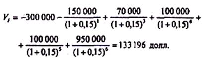 В качестве примера использования NPV рассмотрим задачу на определение стоимости земельного участка в предположении, что на нем планируется офисная постройка в качестве одного из вариантов наиболее эффективного использования. Затраты на постройку офисного здания составляют 500 000 долл., из которых 300 000 долл. приходятся на начало 1-го года, 150 000 долл. — на конец 1-го и 50000 долл. — на конец 2-го гола. Предполагается, что объект недвижимости начнет приносить доход в виде чистой аренды начиная с конца 2-го года в соответствии с данными, приведенными в табл. 7.6, и будет продан через 6 лет после первоначальной инвестиции за 850 000 долл. за вычетом расходов на продажу. Ставка дисконтирования определена в 15%.
