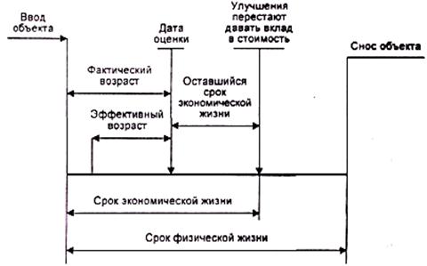 Поскольку накопленный износ по совокупности всех его типов в той или иной мере зависит от срока жизни объекта недвижимости, рассмотрим содержание основных оценочных понятий, характеризующих этот срок (рис. 12.2).