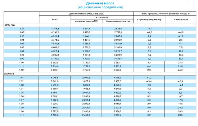 Денежная масса определяется как совокупность денежных средств в валюте Российской Федерации, предназначенных для оплаты товаров, работ и услуг, а также для целей накопления нефинансовыми организациями и физическими лицами — резидентами Российской Федерации. Источником информации для расчета денежной массы являются данные ежемесячного сводного бухгалтерского баланса кредитных организаций Российской Федерации и сводного бухгалтерского баланса Банка России (в расчет включаются обязательства кредитных организаций и Банка России перед хозяйствующими субъектами) [21].