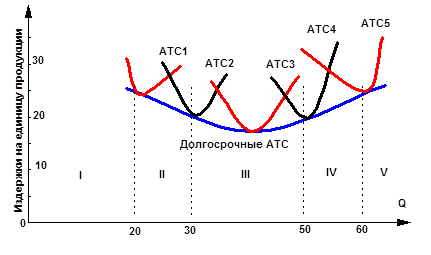 На рис.5 представлены пять различных вариантов (I-V) размеров предприятия, рассчитанных на производство различных объёмов продукции при наименьших средних издержках ATC. Эти варианты фирма может рассматривать как ступени своего роста. На каких-то промежутках (ступенях) своей деятельности она не меняет своих производственных мощностей, а использует то, что имеется, т.е. можно полагать, что на каждой ступени фирма функционирует в краткосрочном периоде. Поэтому кривая, описывающая её издержки на данном этапе, будет кривой краткосрочных средних общих издержек.