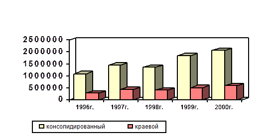 Таким образом, анализ приведенных в таблице данных показывает, что в связи с выше перечисленными причинами размер поступлений подоходного налога в 2000г. значительно возрастает по сравнению с 1999г., рост составит 210019 тыс. руб. или 11%, в т.ч. по краевому бюджету – 13%. Рис.7 иллюстрирует долю краевого бюджета в консолидированном бюджете края в динамике.