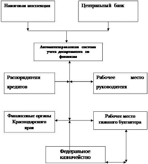 Система автоматизации, применяемая в департаменте по финансам, бюджету и контролю, взаимодействует с налоговой инспекцией, центральным банком, распорядителями кредитов, подчиненными финансовыми органами Краснодарского края, представляет рабочее место главного бухгалтера и руководителя финансового департамента (рис.19).