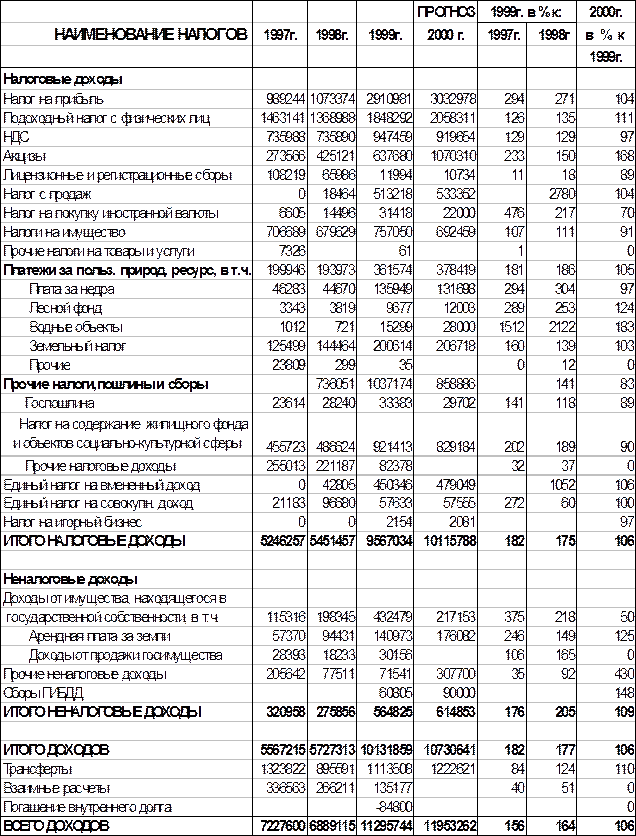 | Наименование налогов | 1997г. | Процент в общей сумме доходов | 1998г. | Процент в общей сумме доходов | 1999г. | Процент в общей сумме доходов |