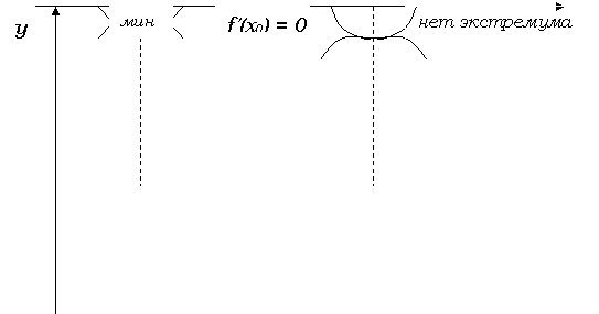 III. f¢(x) > 0 как при x < x0 так и при x > x0 либо же f¢(x) < 0 и слева и справа от x0, т. е. при переходе через x0 f¢(x) не меняет знака. Тогда функция либо все время возрастает, либо все время убывает; в любой близости x0 с одной стороны нгайдутся точки x, в которых. f(x) < f(x0), а с другой – точки x, в которых f(x) > f(x0), так что в точке x0 никакого экстремума нет.