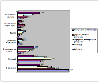 Важно отметить, что кофейни, фаст-фуд и рестораны при гостиницах респонденты чаще всего посещают с друзьями, а вот недорогие повседневные рестораны и дорогие элитные рестораны - с семьей. Чаще других выбирают друзей для компании при посещении кофеен жители Центрального федерального округа - 72,3%, жители Северо-Запада напротив предпочитают всем компаниям семейный круг, так поступают 41,6% респондентов. Чаще других берет своих друзей в кофейни молодежь в возрасте от 18 до 24 лет (74,4 %) и холостые (незамужние) респонденты - 75,9 %. Респонденты из городов с населением менее 100 тыс. человек чаще других указывали, что предпочитают посещать кофейни в обществе деловых партнеров (7,7%). Чаще остальных посещают фаст-фуд с друзьями незамужние (холостые) респонденты - 55,9%. Также стоит отметить, что представительницы женской половины респондентов значительно реже, чем мужчины, предпочитают посещать фаст-фуды в одиночестве (1,9%).