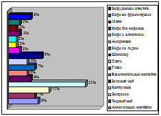 Посетители кофеен чаще всего заказывают каппучино - 21% опрошенных, на втором месте по популярности - эспрессо (11%). Шоколад выбирает 9% опрошенных, алкогольные коктейли - 8%, черный чай - 7%. Жители Центрального федерального округа, а также респонденты из малых городов (менее 100 тыс. населения) чаще других заказывают алкогольные коктейли (38,0% и 42,1% соответственно). Жители городов-миллионников чаще, чем другие категории опрошенных, при посещении кофеен заказывают шоколад (8,4%) и кофе во френч-прессе (6%). Гораздо меньшей популярностью, чем в среднем по выборке, в городах-миллионниках пользуются безалкогольные коктейли (5,6%). Зато этот вид напитков наиболее распространен среди респондентов в возрасте 18-24 лет (22,6%). Кофе без кофеина значительно чаще, чем в среднем по выборке, в кофейнях заказывают респонденты в возрасте 45-59 лет (8,6%). Кофе глясе чаще предпочитают заказывать жители городов-миллионников (17,5%), респонденты с неполным высшим и высшим образованием (14,6%) и высоким уровнем дохода (15,1%). Респонденты со средним уровнем дохода, наоборот, значительно реже заказывают этот напиток (4,2%). А респонденты из городов с населением менее 100 тыс. человек вообще не указывали этот напиток в списке предпочтений.