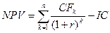 Допустим, делается прогноз, что инвестиция (IC) будет генерировать в течение n лет годовые доходы в размере CF1, CF2, .,CFn. Общая накопленная величина дисконтированных доходов (Present Value, PV) и чистая приведенная стоимость (Net Present Value, NPV) соответственно рассчитываются по формулам: