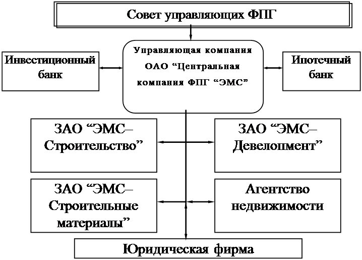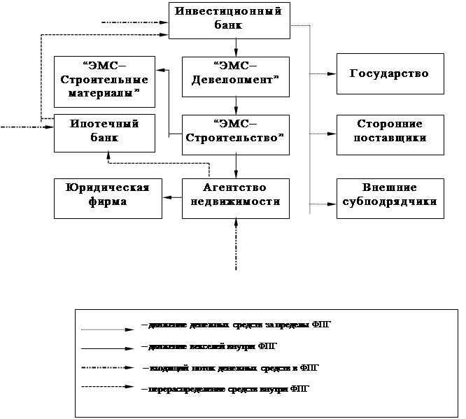 Этап строительства. На данном этапе задействованы все участники ФПГ. ЗАО “ЭМС–Строительство” производит строительные работы, ЗАО “ЭМС–Строительные материалы” производит поставку строительных материалов на объект (являясь основным поставщиком). Инвестиционный банк производит финансирование проекта, ЗАО “ЭМС–Девелопмент” производит приемку работ по отдельным этапам и в конце периода — всего объекта, Агентство недвижимости и Ипотечный банк занимаются продажей квартир и прав долевого участия в проекте конечным покупателям (в основном частным лицам), Юридическая фирма проводит экспертизу договоров с внешними поставщиками и субподрядчиками, а так же чистоту документов на квартиры передаваемые в залог или в зачет под покупку новых квартир.