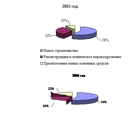 Из данного рисунка следует, что воспроизводственная структура капитальных вложений изменилась в 2006 г. по сравнению с 2003 г.за счет роста доли приобретения новых основных средств в два с лишнем раза, а также за счет снижения доли реконструкций и технического перевооружения на 8%.