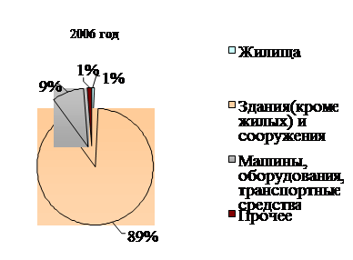 В 2005 году в ЕАО наблюдается структурная переориентация инвестирования. В качестве объектов вложения в большей мере выступает пассивная часть основных фондов – здания (кроме жилых) и сооружения. В 2006 году их удельный вес в общем объеме инвестиций составляла 78%, в 2005 году – 89%. При этом удельный вес активной части основных фондов - машины, оборудование, транспортные средства сократился с 18% до 9%. В структурном отношении сокращается объем инвестирования в жилища – с 3 до 1%. Данную тенденцию можно проследить на рисунке 3.