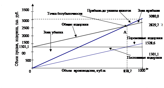 Согласно полученным расчетам по проекту А годовой объем производства пиломатериалов, при котором предприятие не получает прибыли, но и не несет убытков составляет 838,7 куб. м.