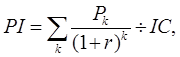 Следующий метод расчета эффективности капитальных вложений – индекс рентабельности (прибыльности, доходности) инвестиций (Profitability index, PI), который рассчитывается как отношение чистой текущей стоимости денежного притока к чистой текущей стоимости денежного оттока (включая первоначальные инвестиции) по формуле [26, с.58]: