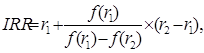 Для расчета IRR выбирается два значения коэффициента дисконтирования r1 < r2 таким образом, чтобы в интервале (r1,r2) функция NPV = = f(r) меняла свой знак с «+» на «-» или с «-» на «+». Далее применяют формулу [26, с.62]: