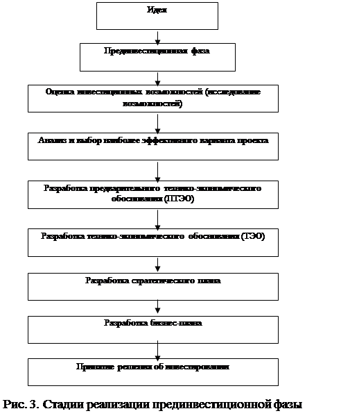 По своей структуре ПТЭО и ТЭО должны быть одинаковыми. Различие состоит в степени детализации рассматриваемой информации и глубине проработки проекта [42; С.65]. ПТЭО (ТЭО) представляют собой комплекс расчетно-аналитических документов, которые должны содержать исходные данные и основные оценочные показатели, с помощью которых рассчитывается эффективность будущего инвестиционного проекта. Они должны содержать оценку инвестиционных возможностей, предпроектную проработку инженерно-конструкторских, технологических, организационных, управленческих решений, выбор альтернативных материалов. Стадии реализации прединвестиционной фазы приведены на рис. 3.