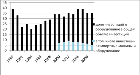 Рис. 1- Динамика инвестиций в основной капитал и доля инвестиций в машины и оборудование в общем объеме инвестиций, 1990-2007 гг. (в %)