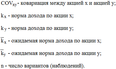 Для расчета ковариации с использованием фактических (исторических) данных о доходах ценных бумаг используют следующую формулу: