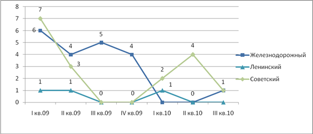 Наибольший объем предложения в Кировском районе, порядка 18 объектов. Это связано с тем, что район находится на окраине города, в промышленной зоне. Далее по объему предложения шли Куйбышевский, Железнодорожный и Октябрьский районы (порядка 6 объектов). В остальных районах объем предложения достаточно мал, а в некоторых вообще равен 0. Наибольший объем приходится на 1 квартал 2009 года, т.е. начало рассматриваемого периода и на 3 квартал 2010, т.е. на конец рассматриваемого периода.