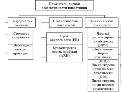 В последнее время многие управленческие решения, касающиеся принятия каких-либо проектов, в большинстве своем основываются на результатах экономического анализа с использованием показателей оценки эффективности капитальных вложений. Предлагается следующая классификация показателей оценки эффективности инвестирования, которые являются наиболее популярными на практике и используются как российскими предприятиями, так и компаниями в странах с развитой рыночной экономикой (рис. 1.3).
