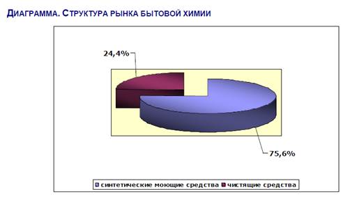 Как можно заметить, на рынке преобладают синтетические моющие средства, которые занимают 75,6% рынка. На долю же чистящих средств приходится 24,4%.