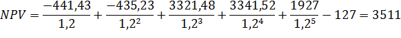 Чистая текущая стоимость проекта (NPV) при ставке сравнения 20% годовых и интервале планирования 5 лет составляет:
