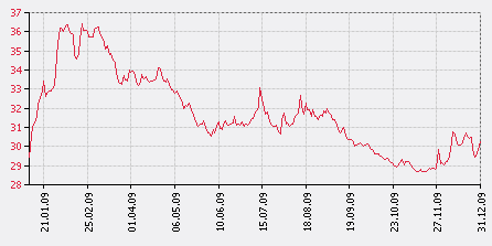 Рис. 2.2 - Курсы ЦБ РФ по валюте "Доллар США" за период с 01.01.2009 по 31.12.2009