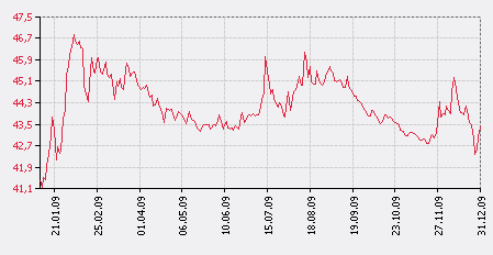 Рис. 2.3 - Курсы ЦБ РФ по валюте "ЕВРО" за период с 01.01.2009 по 31.12.2009