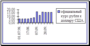 Из диаграммы видно, что курс рубля изменялся в августе - сентябре 1998 г. скачками. При этом необходимо учитывать, что инфляционные последствия скачкообразного изменения курса рубля оказываются гораздо более ощутимыми , чем если бы курс рубля “опускался” постепенно: дополнительно стимулировали рост цен массовое “бегство” от рубля, ажиотажный спрос населения на многие виды товаров и появление локальных товарных дефицитов в разгар кризиса.