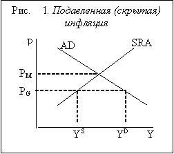 • Подавленная (скрытая) инфляция имеет место в случае, когда цены устанавливает государство, причем на уровне ниже, чем равновесный рыночный (устанавливаемый по соотношению спроса и предложения на товарном рынке) (рис. 1.). Главная форма проявления скрытой инфляции – дефицит товаров.