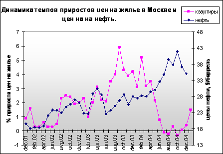Одним из главных факторов, определяющих цены рынка недвижимости, являются цены на нефть. Экспертами изучена данная взаимосвязь между ценами, она имеет характер прямой корреляции. Однако рост цен на нефть, не всегда означает рост цен на недвижимость. В условиях нестабильности экономики, взаимосвязь может нарушаться. Примером было 2-е полугодие 2004 года, когда при небывало высоких ценах на нефть, цены на недвижимость остановили свой рост. Данная взаимосвязь показана ниже на диаграмме 10.