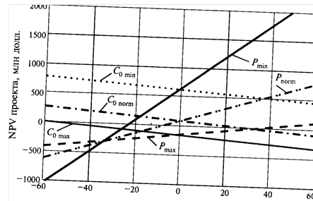 Кривые на графике (рис.2) пересекаются в точке, соответствующей рассчитанному ранее значению NPV0. Очевидно, что в данной точке все параметры имеют нулевое отклонение (на рис.2 показано изменение NPV при сдвиге только одного из параметров).