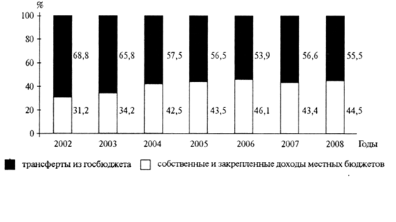 Из рисунка 1 видно, что доля трансфертов из госбюджета в общем объеме доходов местных бюджетов составляет в среднем 40,7%. Во времени эта динамика несколько меняется. Например, начиная с 2004 г. доля трансфертов возросла против 2003 г. на 8,3 процентного пункта, ибо расширились новые виды дополнительных привлечений средств в местные бюджеты за счет внедрения техногенных субвенций и субвенций на социально-экономическое развитие. В 2008 г. по сравнению с 2007 г. доля трансфертов тоже выросла, но не так существенно - всего на 1,1 процентного пункта. Если же сравнить показатели за 2008 и 2002 годы, то увидим, что рост составил 13,3%. Доли трансфертов из госбюджета в разрезе регионов также ощутимо разнятся, например, в 2007 г. наблюдаются колебания от 12,0% в Киеве до 68,7% в Тернопольской области.