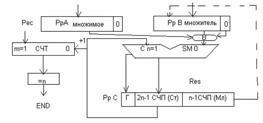 2. А в схеме умножения, начиная с младших разрядов множителя со сдвигом СЧП вправо для представления множимого требуется n-разрядный регистр.
