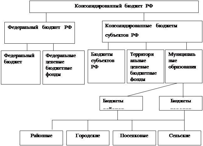 Бюджетная система РФ включает: федеральный бюджет, 21 республиканский бюджет республик в составе РФ, 55 краевых и областных бюджетов и бюджеты городов Москвы и Санкт – Петербурга, один областной бюджет автономной области, 10 окружных бюджетов, автономных округов и около 29 тысяч местных бюджетов.
