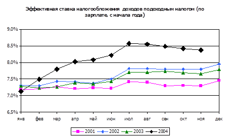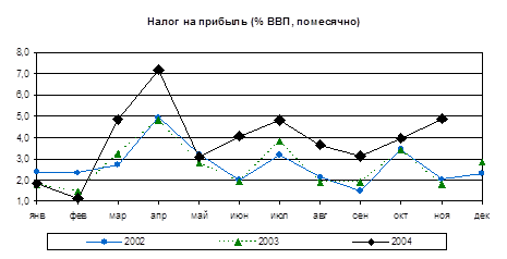 Общие поступления налоговых доходов без учета налогов, предназначенных для формирования территориальных бюджетных дорожных фондов, увеличились в январе-ноябре текущего года на 0,8% ВВП, до 10,0% ВВП. Как уже было отмечено, основным источником роста стало значительное увеличение поступлений по налогу на прибыль: по итогам одиннадцати месяцев их объемы увеличились относительно аналогичного периода прошлого года на 1,3% ВВП. Наблюдалось также некоторое увеличение поступлений по налогам на совокупный доход (на 0,2% ВВП) и незначительный, в пределах 0,1% ВВП, рост акцизов (без учёта акцизов на ГСМ). Эти положительные эффекты полностью скомпенсировали сокращение в текущем году поступлений по отмененному налогу с продаж (на 0,4% ВВП) и платежей за пользование природными ресурсами, которые с начала 2004 года были перераспределены в пользу федерального бюджета РФ (на 0,2% ВВП). Поступления подоходного налога, выраженные в процентах ВВП, вышли по итогам одиннадцати месяцев на уровень января-