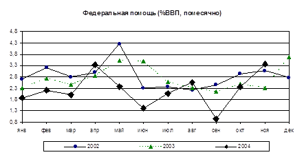 Динамика перечисления федеральной помощи регионам в текущем году несколько изменилась. Весенний пик выплат в этом году был пройден в апреле, тогда как в предыдущие годы он приходился на май, либо на июнь. Кроме этого в 2004 году имели место опережающие выплаты федеральной помощи в августе с заметным, но не запланированным, снижением её в сентябре. В октябре объём безвозмездных перечислений вернулся к