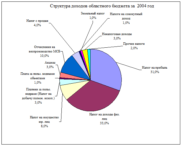 1.По структуре налоговых и неналоговых доходов областного бюджета за 2004 год основную долю доходов (72%) занимали следующие виды налогов (налог на доходы физических лиц – 33%, налог на прибыль организаций-31%, налог на имущество -8%). Аналогичное экономическое положение налогов в целом характерно и для 2004 года, как для территориального бюджета, так и большинства местных бюджетов.