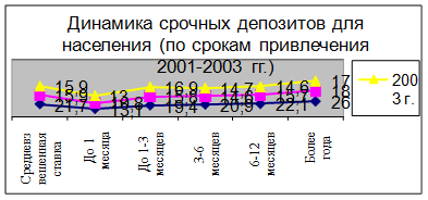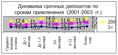 Рис.2.4. Динамика стоимости срочных депозитов для субьектов хозяйствования по срокам привлечения (2001-2003 годы)
