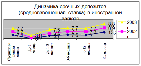 Для данной группы вкладчиков отмечается следующая картина. В 2001 году данные депозиты для субьетов хозяйствования не имели места. В 2002 и 2003 годах по средневзвешенной ставке различия составляют 0,5 процентного пункта (рост в 2003 году), по группе от 1 до 3 месяцев в 2003 году рост составляет 1,5 проценного пункта. Начиная с группы от 3 до 6 месяцев в 2003 году идет снижение депозитных ставок (от 1 до 3 месяцев снижение на 3,6 процентных пункта, от 6 до 12 месяцев на2,3 проценных пункта и более года на 0,7 процентного пункта).Перейдем к анализу срочных депозитов для физических лиц в иностранной валюте.