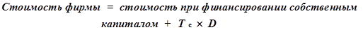 Таким образом, беря займы, фирма уменьшает долю правительства в своей прибыли и увеличивает поток денежных средств, получаемых акционерами и держателями долговых обязательств. Стоимость фирмы после уплаты налогов (сумма стоимостей ее долговых обязательств и собственного капитала ) таким образом повышается на приведенную стоимость налоговой защиты.