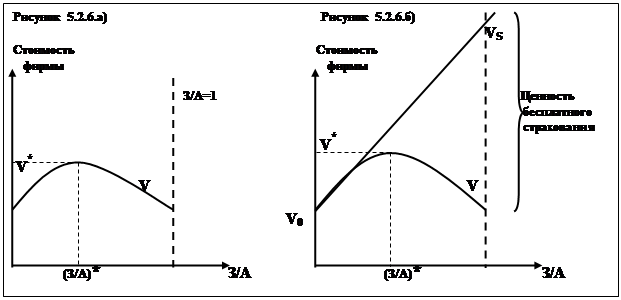 Оптимальная структура капитала с явным и скрытым страхованием показана на Рисунке 5.2.6.г) вдоль прямой (З/А)**. Соответствующая ценность застрахованного банка показана прямой V**. Поскольку V** больше, чем V*, банк, стремящийся максимизировать свою стоимость, будет заключать договоры о страховании депозитов и соблюдать все требования регулирующих органов (т.е. выполнять условия скрытого страхования).